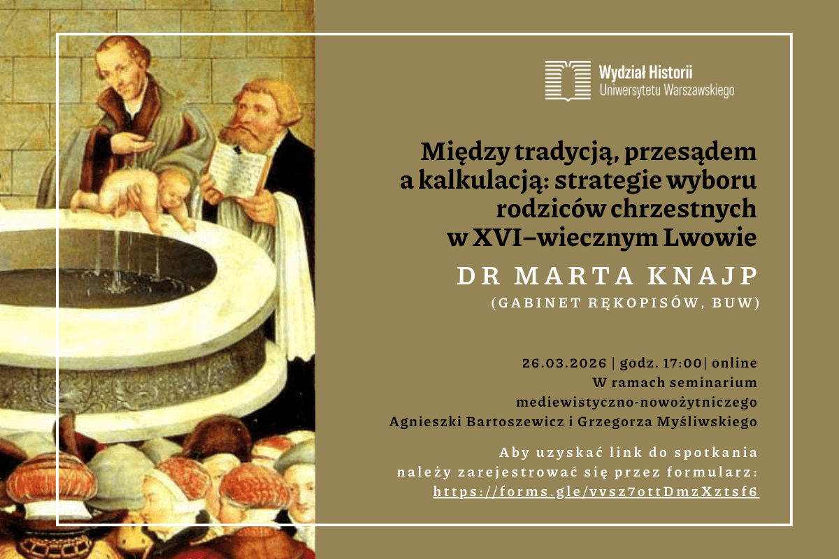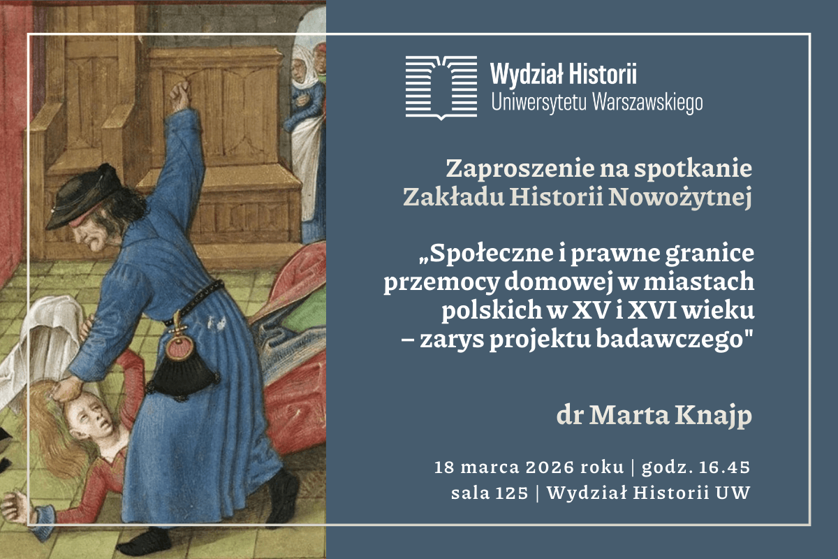 Zapraszamy na zebranie Zakładu Historii Nowożytnej odbędzie się w dniu 18 marca 2026 r. (środa) o godz. 16:45 w sali 125. Podczas spotkania dr Marta Knajp wygłosi wystąpienie pt.:„Społeczne i prawne granice przemocy domowej w miastach polskich w XV i...
