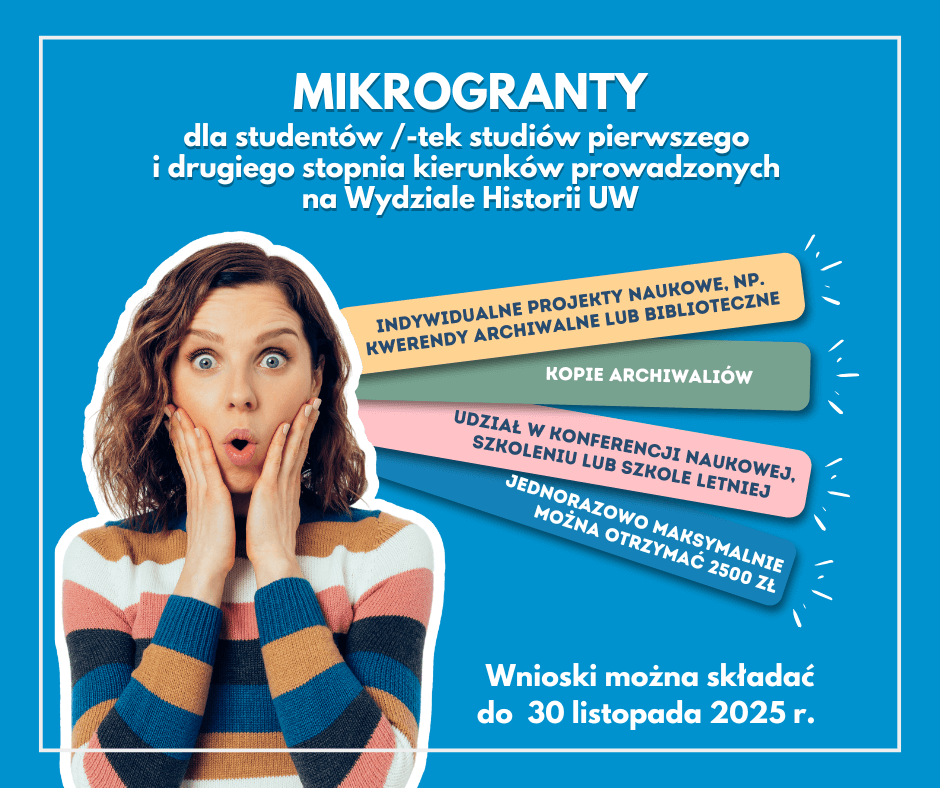 Informujemy o możliwości uzyskania mikrograntu na działalność naukową studentek i studentów Wydziału Historii UW.