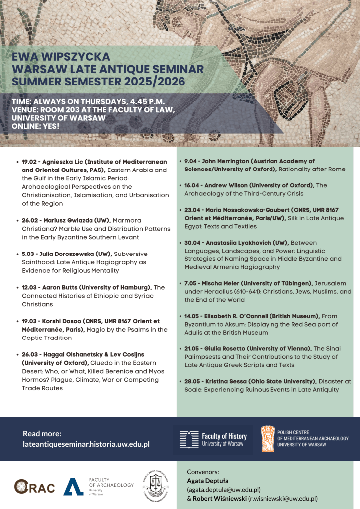 Zapraszamy na kolejny cykl Ewa Wipszycka Warsaw Late Antique Seminar, zawsze w czwartek, godz. 16.45, sala 203 na Wydziale Prawa Uniwersytetu Warszawskiego.